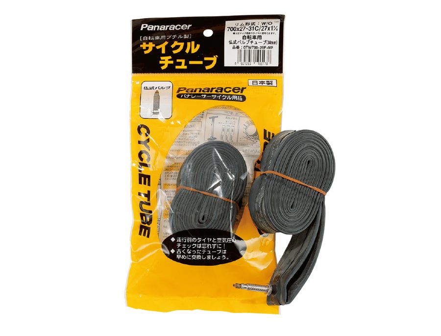 各サイズがそろい、国産の品質で安心感も高いのがパナレーサーのスタンダードチューブ。黄色い袋が目印。バルブ長に注意