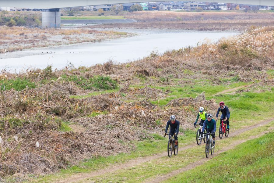 普段ロードバイクで走っているのとそれほど変わらないペースで多摩川へと到着した4人。多摩川は土手上の道は舗装されているが、河川敷まで下りれば砂利道やダートなど未舗装路が多い。未舗装ながら平坦であるため、グラベル初級者でも走りやすいのが特長だ。ここでエクスプローロは持ち前の走行性能を最大限に発揮。ダート上でも舗装路のようにスムーズな走りができた。