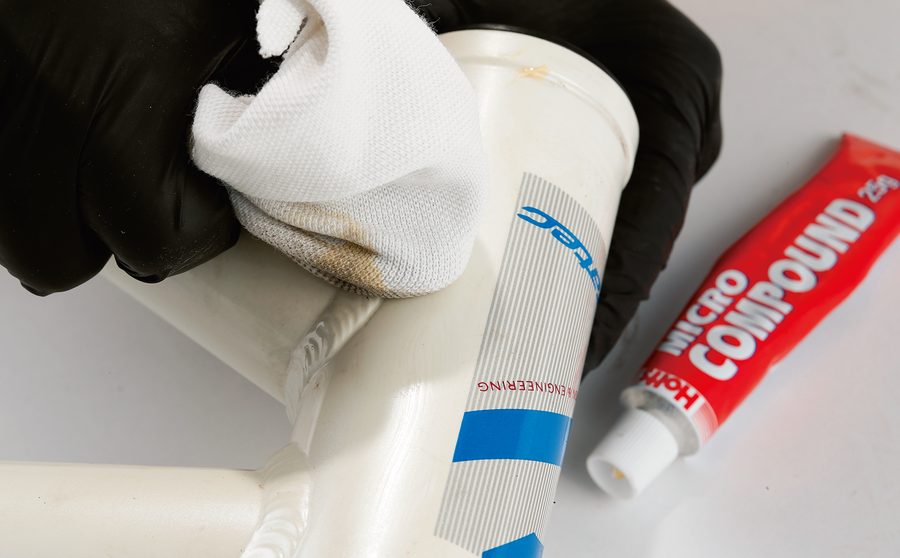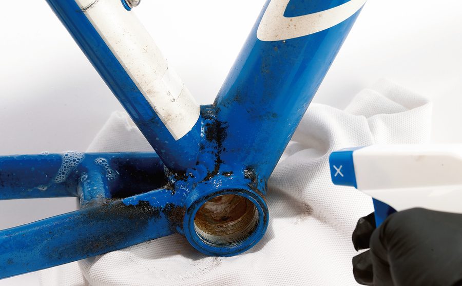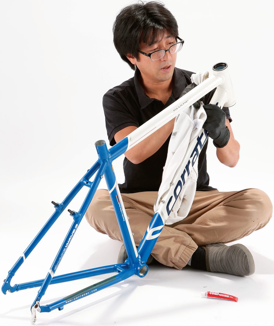 フレーム単体状態なので、クリーニングはかなりやりやすいはず。ホコリがひどい場合はここで水洗いしてもいいが、溶剤入りのクリーナーなどがあれば、油汚れもいっしょに落とせるので効率的だ。