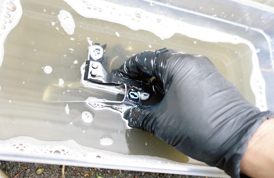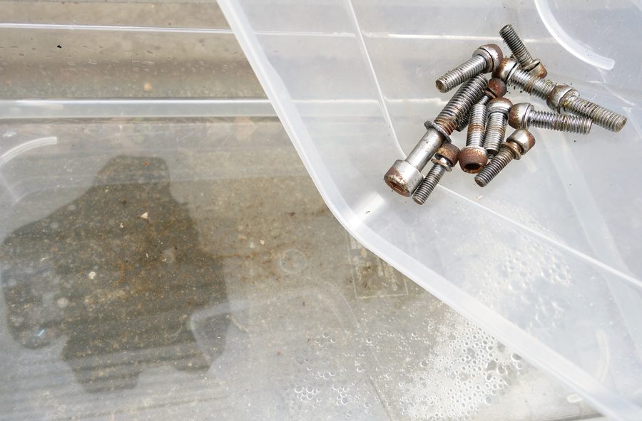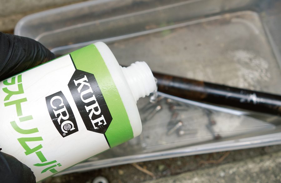 サビを落としたいパーツはまとめて、リン酸の水溶液にドブ浸けする。リン酸はサビを溶かし落とし、同時にリン酸皮膜処理されるのでサビづらくなる。