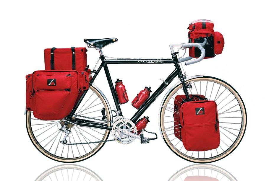 1983年、創業から12年⽬にして初のキャノンデールブランドのバイク、Touringを発表。トップチューブが地⾯と⽔平な「ホリゾンタル」フレームをもち、創業時から製造技術を培ってきたサイクルバッグなども組み合わせられた当時の写真は、今⾒ても⾮常にスタイリッシュである。