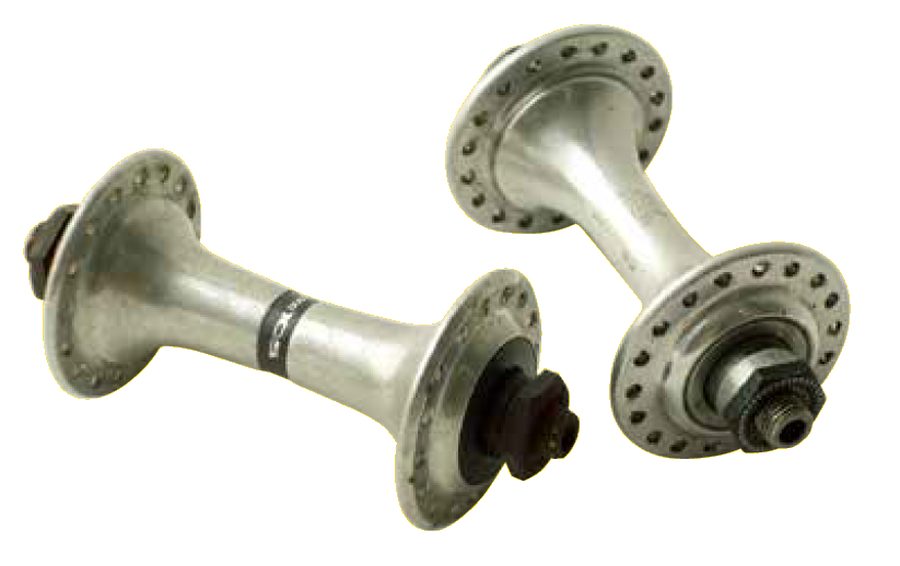 回転部分は、フロントハブ2個を使用する。ハブ本体がローラーとなるアイデアだ。ハブの中心にタイヤが乗るので、左右がなだらかにアールを描くタイプの古いフォルムのハブが適している。リアハブ2個でも代用できるが、ロックナット間寸法が、ハブの年代によってが異なることが多いので注意。