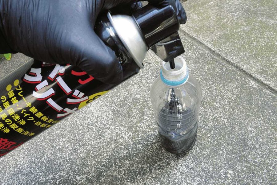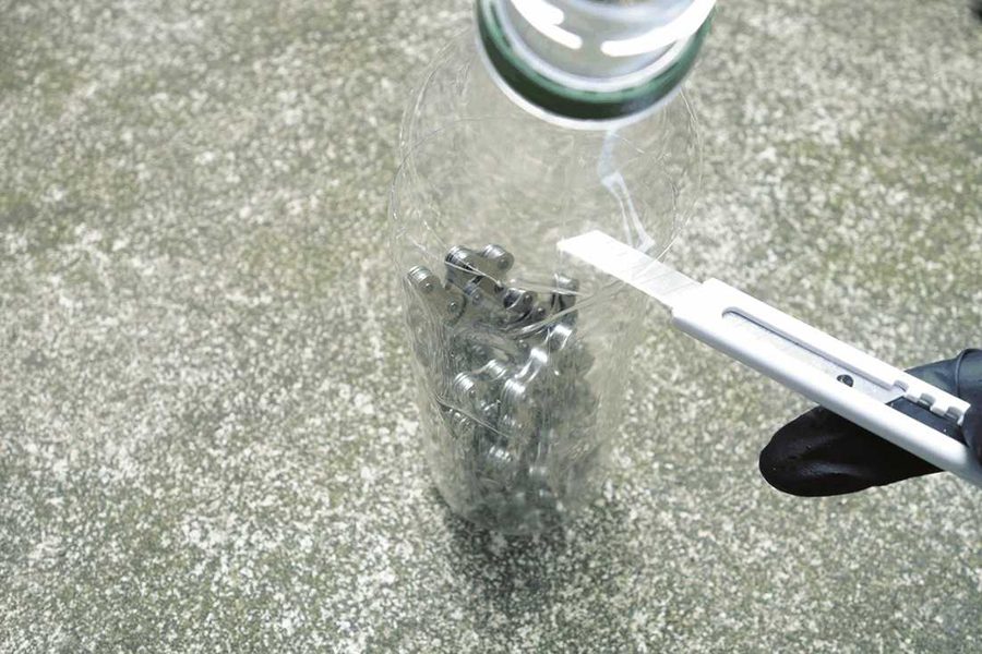 空いたペットボトルを洗って、汚れたチェーンを入れる。そこにパーツクリーナーをたっぷりと注ぎ入れる