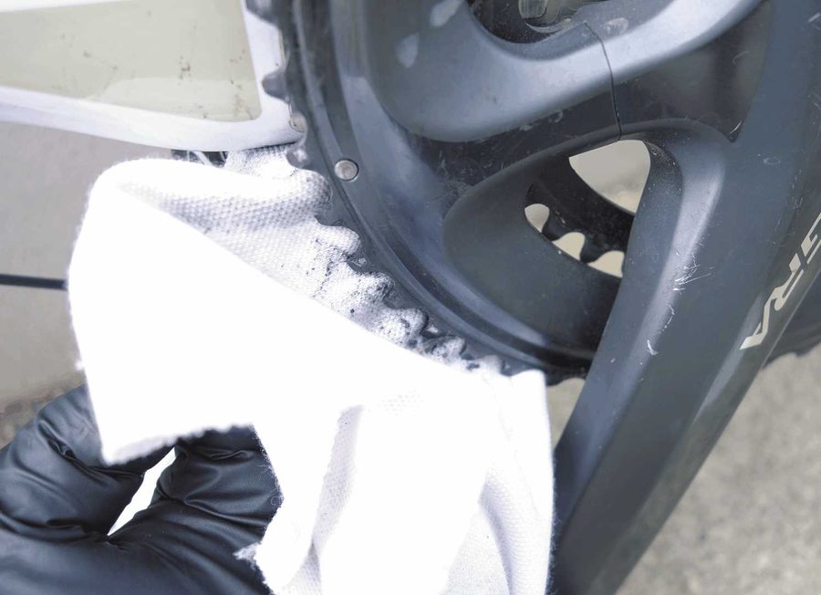チェーンリングは、歯のすきまの汚れも落とすようにクリーナー&ウエスで地道に拭いてクリーニング
