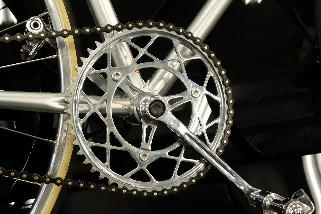 高木の厚歯ギヤにカンパニョーロの3アーム鉄クランク。今野氏のオタクぶりが伺われる