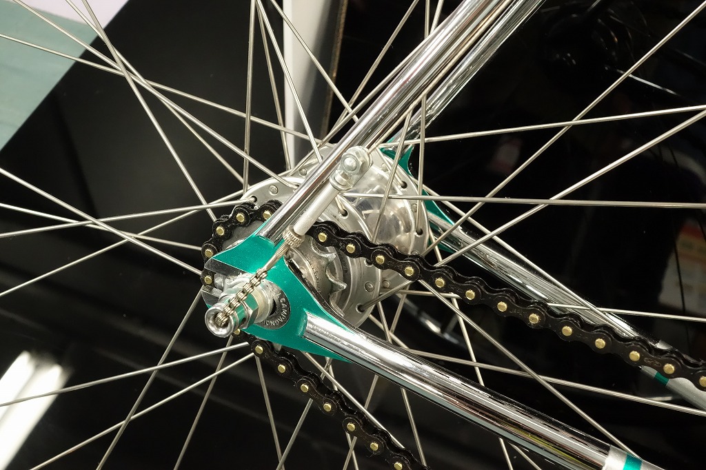 シングルのように見えて内装3段。スターメーアーチャー製のハブギヤだ。都内の移動に使う、3段の固定ギヤの調子はすこぶるよいとか