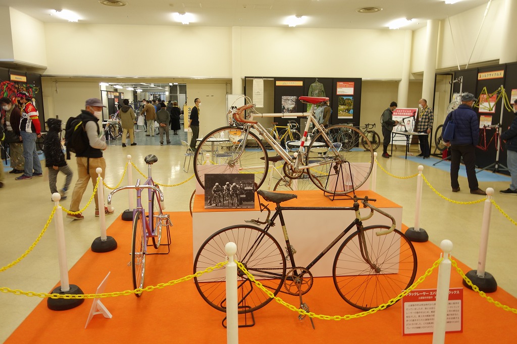 会場エントランスには、1964年のオリンピック試作車のエバレストほか、初期の競輪モデルなどエバレスト3台が登場。エバレストで天才ビルダーとしての頭角を現した梶原氏にちなんでいるようにも見受けられる