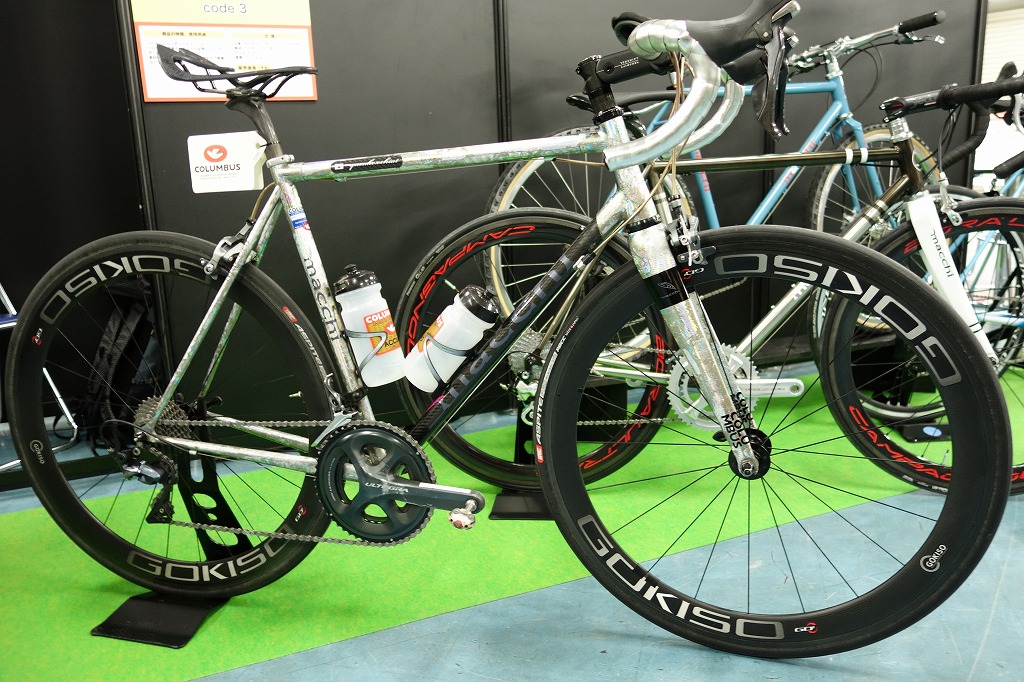 クロモリとカーボンのハイブリッド素材となる。まずはスチールパイプで普通にフレームを作って、それをカットしてカーボンパイプをつないだ。そうしないと微妙に寸法がずれてしまうとか