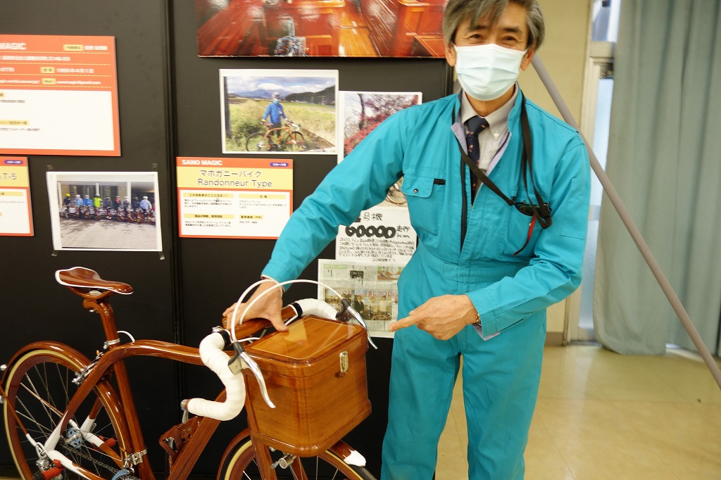 「フロントバッグも木で作ったんだけど、装着するとファンシーなオモチャみたいに見えるので、展示では外してます」と笑うビルダーの佐野さん