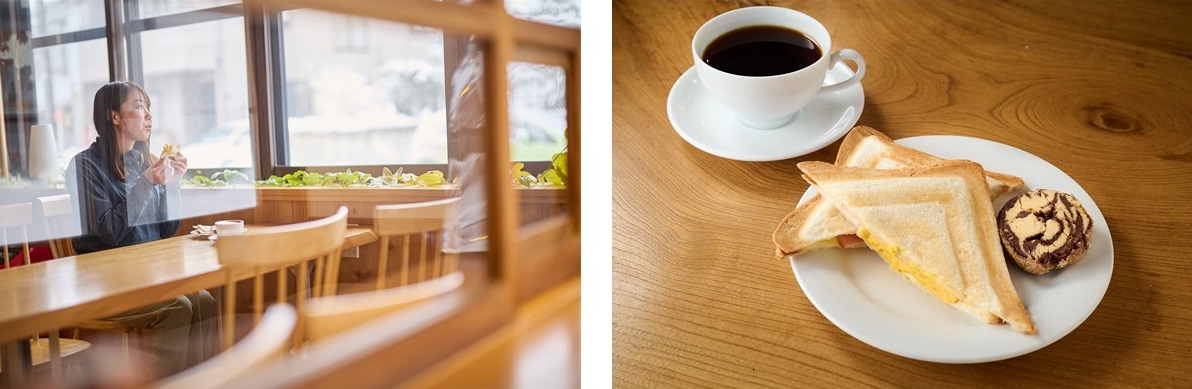 まず向かったのは、ニューヨークでパティシエをしているオーナーが営業するカフェ「mikawa」。朝7時から営業しているので、朝食や行動食の購入にぴったり。朝食におすすめなのがホットサンド。ハム・チーズ・タマゴのホットサンドと、自家製カスタードの2種類から選べる。ずらりと並んだ焼き菓子はどれもおいしそうで、どれにしようか目移りしてしまう!