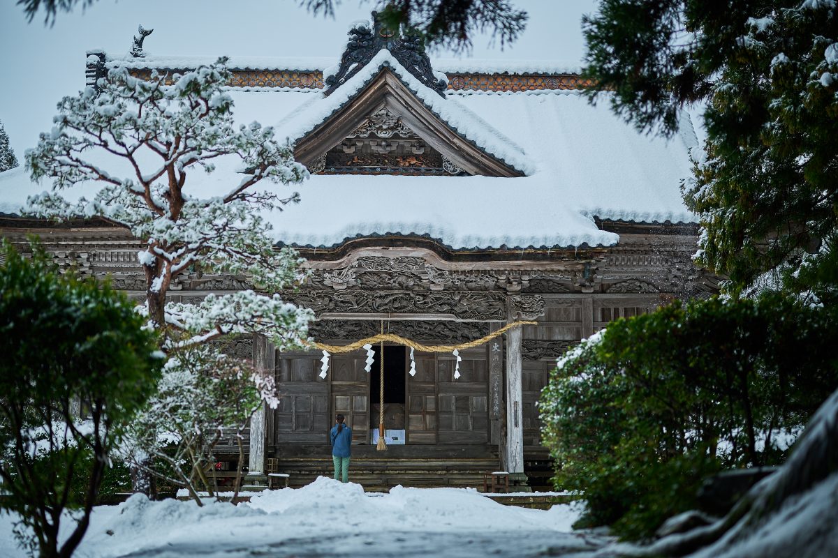 昼食後は佐渡の名所を巡りながらのライド。地元で「天王さん」と呼ばれている牛尾神社は、鯉の泳ぐ姿や順徳上皇などの細かい彫刻が美しい格式高い古社。参道には御神木の安産杉が社を見守るようにそびえる、パワースポットでもある。