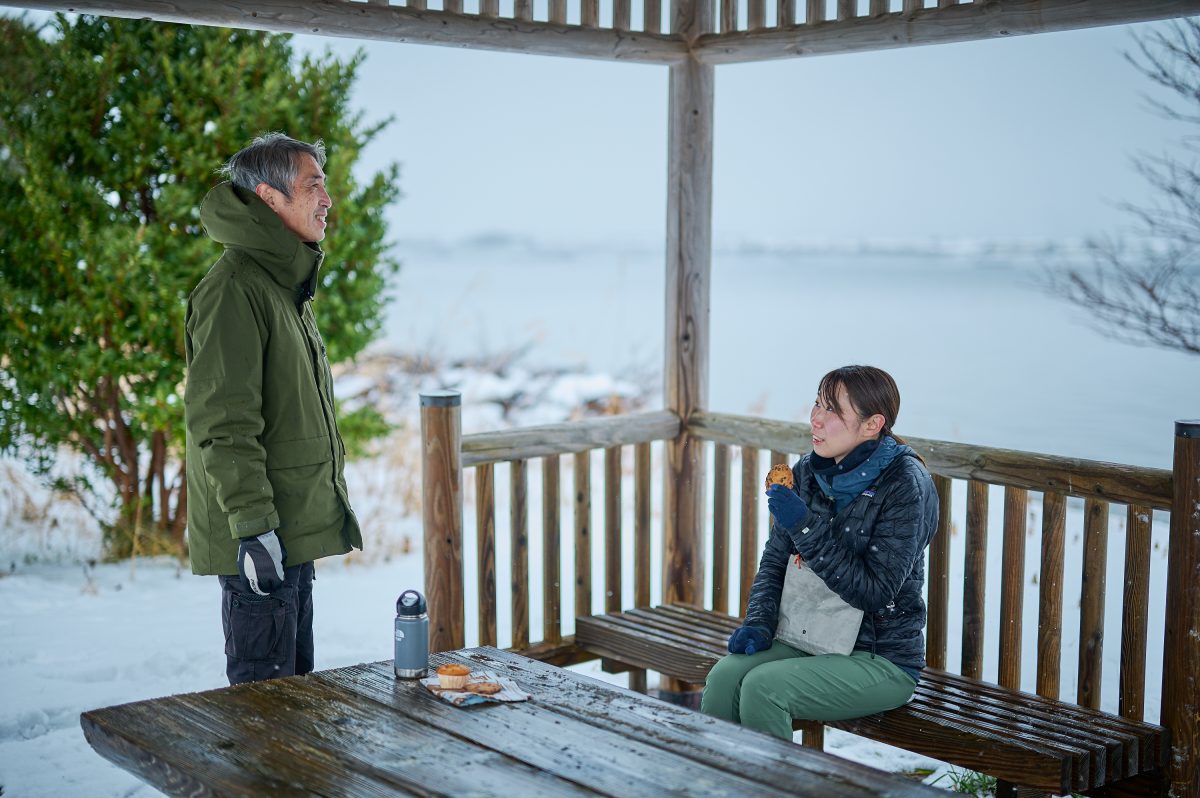 樹崎神社の横にある東屋では、あたたかいコーヒーとmikawaで購入したクッキーでひとやすみ。加茂湖をぐるりと1周するルートなので、つねに湖が近くにある。静寂で澄んだ空気のなかのコーヒーは至福。最後は商店街がなんだかノスタルジックな佐渡の町並みのなかを走りゴール!