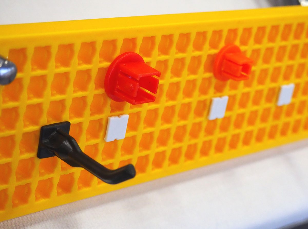 ベースとなるペグボードに対して、フックやクリップの形をしたアクセサリーを装着。自転車整備に使う六角レンチやドライバー、ソケットヘッドなどを挟み込んだりぶら下げたりできる。