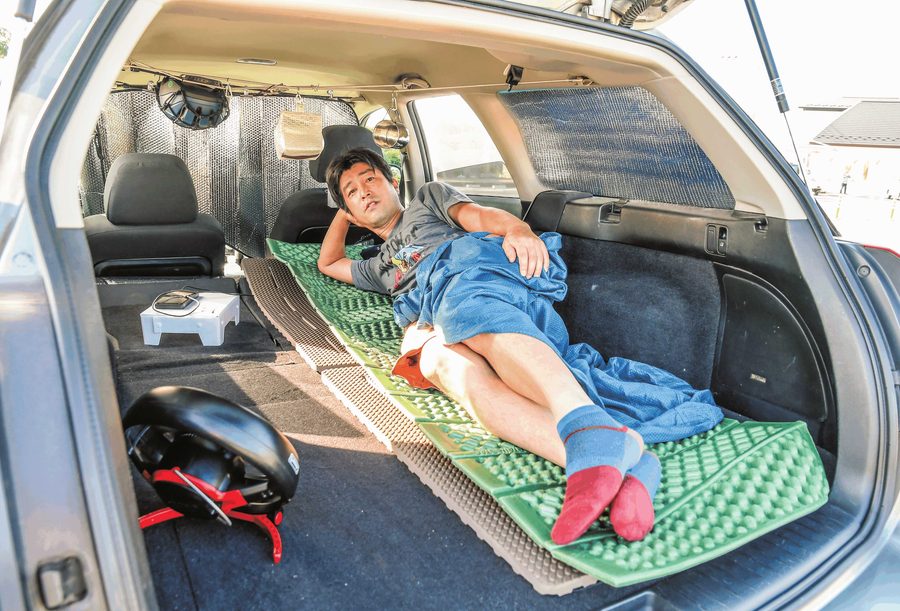 車中泊の第一は、まず車内で寝られるようにすることだ。フラットでクッション性のあるスペースとシェードがあれば寝られる。