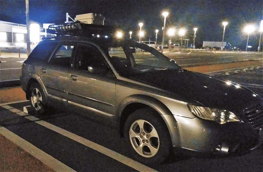やや古めのスバル・アウトバック。比較的フラットな荷室が車中泊向きではある