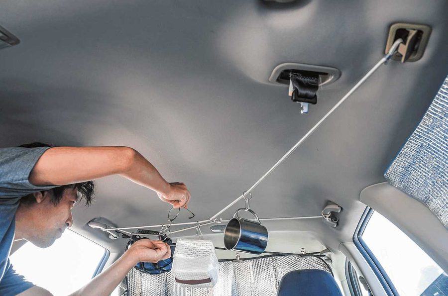 前シェードは、前座席のアシストグリップに渡した荷掛けヒモに、フロントガラス用サンシェードを目玉クリップで止めれば完成!