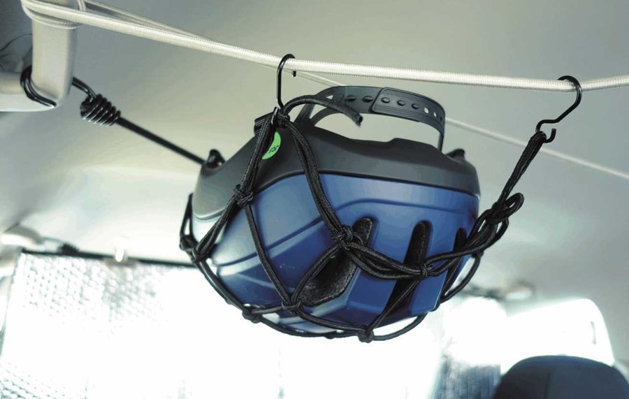 百均で買った自転車用の荷掛けヒモを、車内のアシストグリップなどに掛けて天井収納に。ランタンやメガネなどかけられ便利。かごネットはヘルメット置きになる。
