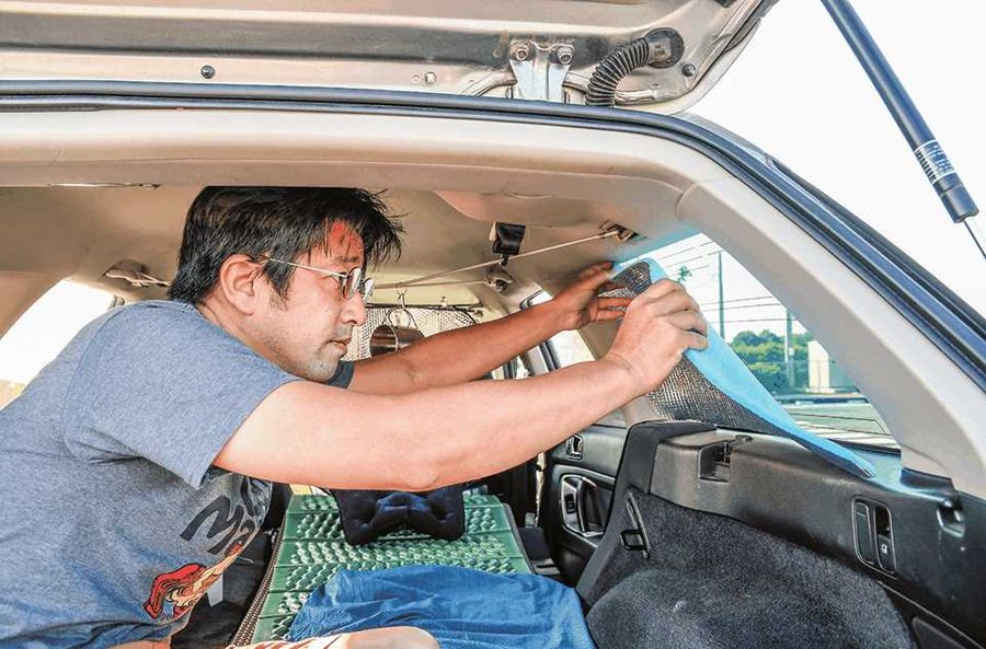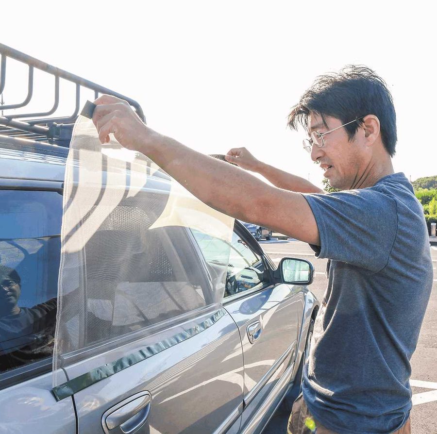 夏場のシーズンは窓を開放しないと寝づらい。蚊よけとなるネットも必需品だ。百均の網戸用ネットとマグネットを使って、クルマのボディーにピタッとくっつくネットを自作。