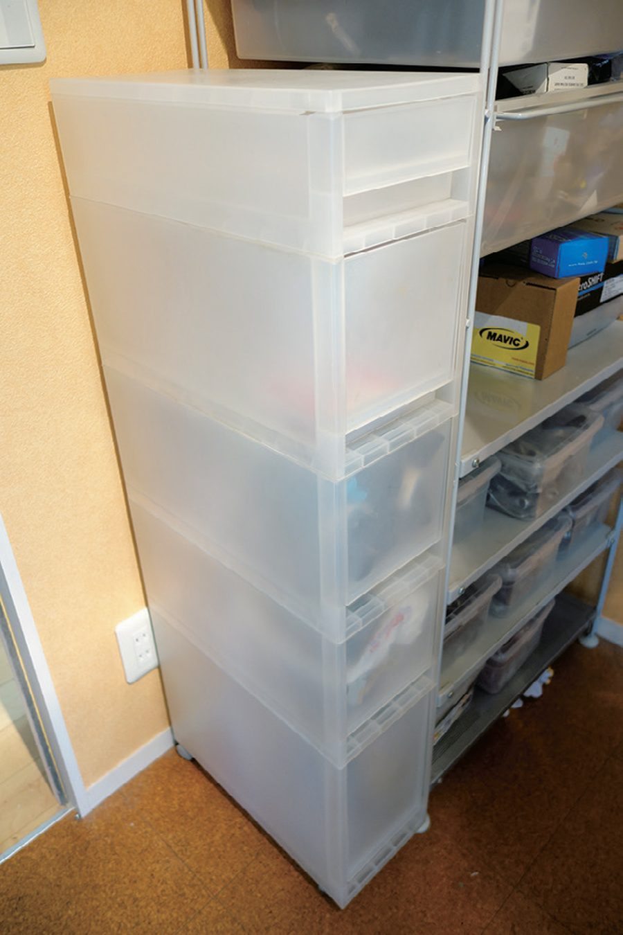 部屋の状況を冷静に見たら、汚くなってしまう理由はあふれた自転車アイテム&パーツが入口をふさぐからではないかと推測。部屋の奥が有効活用されないので、さらにアイテムが入口付近に集中する。出した工具や小物なども奥に戻すのが面倒なので、入口に放置されるという悪循環。まずは入口付近の収納アップを図る。無印ストッカー追加して、ちらかりがちなアイテムを入れられるようにしてみよう。
