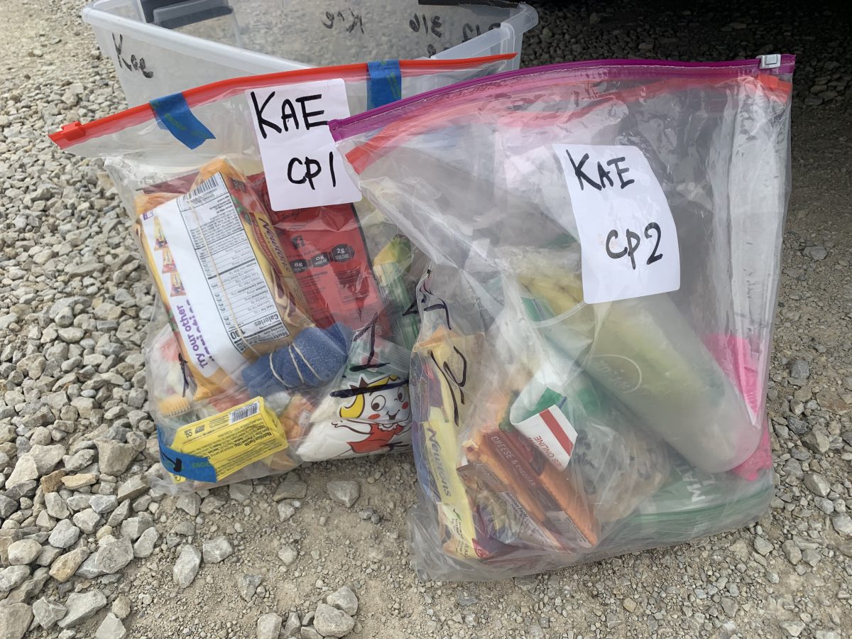私の用意したドロップバッグ。そのときに何が食べたいかわからないので、とにかくたくさん入れておいた。 主催者のサラは「え、それ全部食べるの?!」PHOTO: Kae