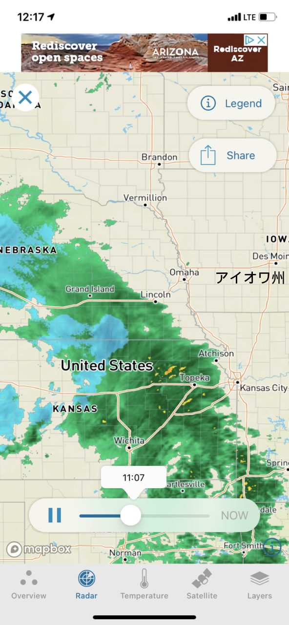 アイオワ州に向けて移動中、レーダーで雪と雨の動向を何度も確認