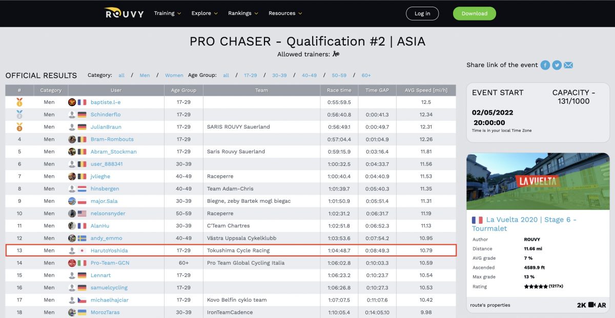 吉田選手はブエルタ2021第20ステージが舞台となった第1戦を14位(年代別[17~29歳]9位)で終えると、2月5日に行われた第2戦(ブエルタ2020第6ステージが舞台)を13位(同6位)でフィニッシュ。そのタフさにレースごとにギブアップする参加者も現れる中、吉田選手はオンラインのライバルを相手に臆することなく戦ってみせた。