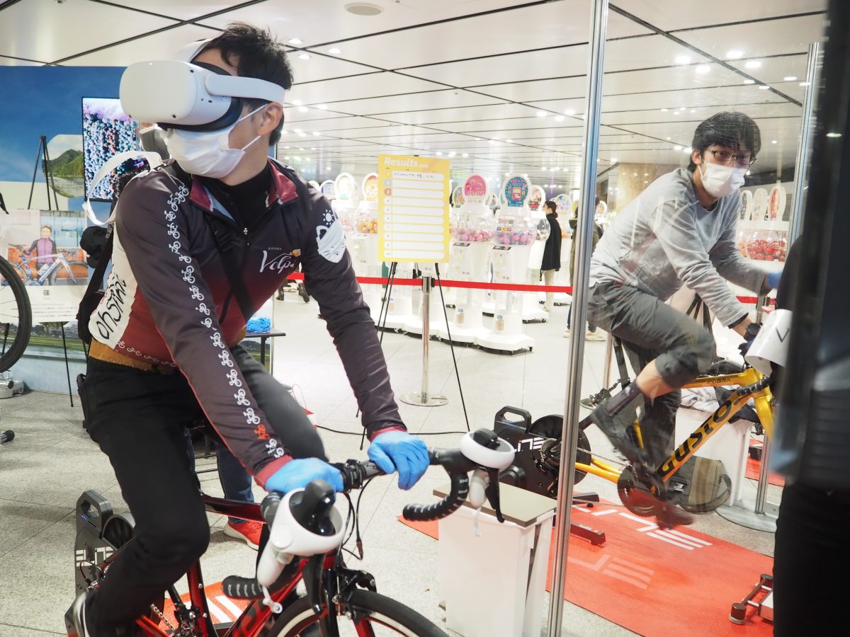 イベント内で特徴的だったのはバーチャルライド! 水郡線まわりのサイクリング風景をVRゴーグル内に映しながら、実際の自転車にまたがってペダリング! 八溝山をはじめ、常陸大宮市の御前山ダム周辺ほか、福島県の久慈川サイクリングロードでは元プロロードレーサー(菅野正明さん、現・福島県塙町地域おこし協力隊)について走行するという疑似体験もできた。
