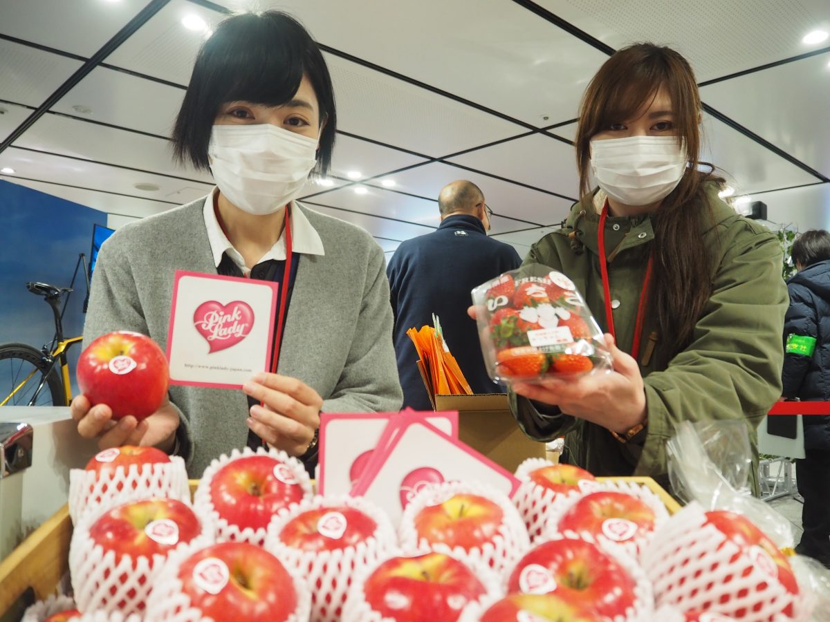 JR水郡線やサイクリングの魅力を伝えるだけでなく、「食」の面でも茨城県並びに大子町は魅力を発信中。県内・町内の特産品を幅広く並べ、自転車に興味のない人も購入できた。特にリンゴは隠れた名産品で、小規模農園ゆえにふだん全国に出回ることない品種や加工菓子に興味を持つ人が多数。このリンゴ、甘味と酸味のバランスが絶妙とのこと。