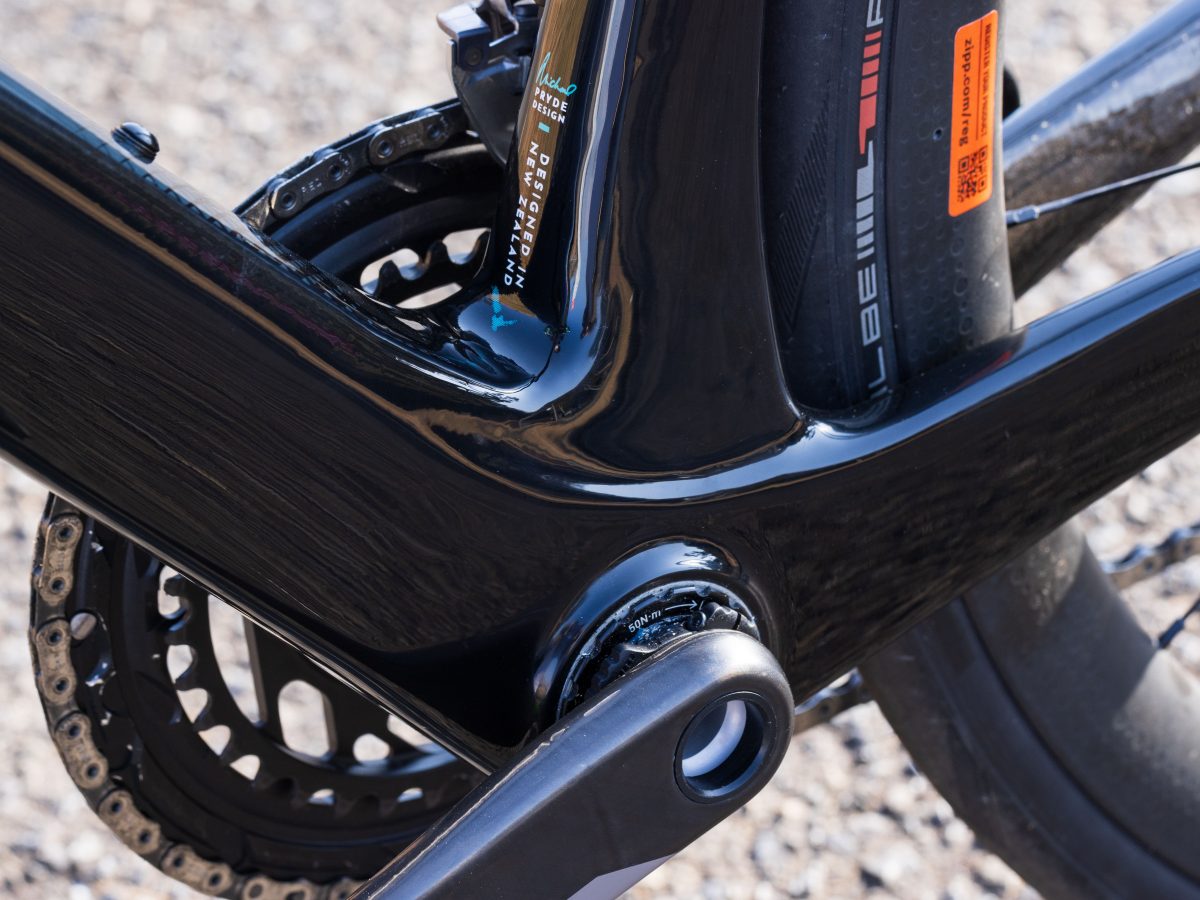 100%東レカーボンフレームの前三角(トップチューブ・ダウンチューブ・シートチューブ)は、ラテックス製マンドレルで成形され、プリプレグカーボンの肉厚や樹脂の流れを面密に調整。過度な剛性や軽さを求めてはいない。その一方で、ヘッドチューブやBBには高張力ディレクションカーボンを採用することで、必要な部分において剛性をしっかりと高めている。