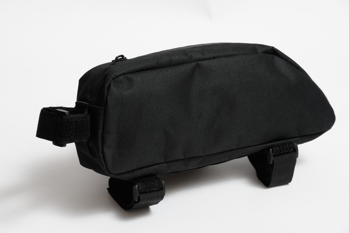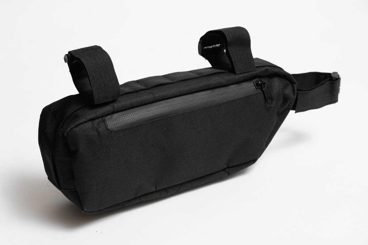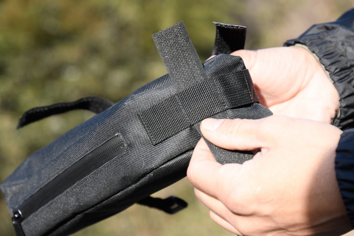 ひっくり返すと、上部にもファスナーがある。これはトップチューブに装着したときの開口部だ。ちょっと大きめのトップチューブバックとして、ライディング時にもアクセスしやすいので、これも便利。