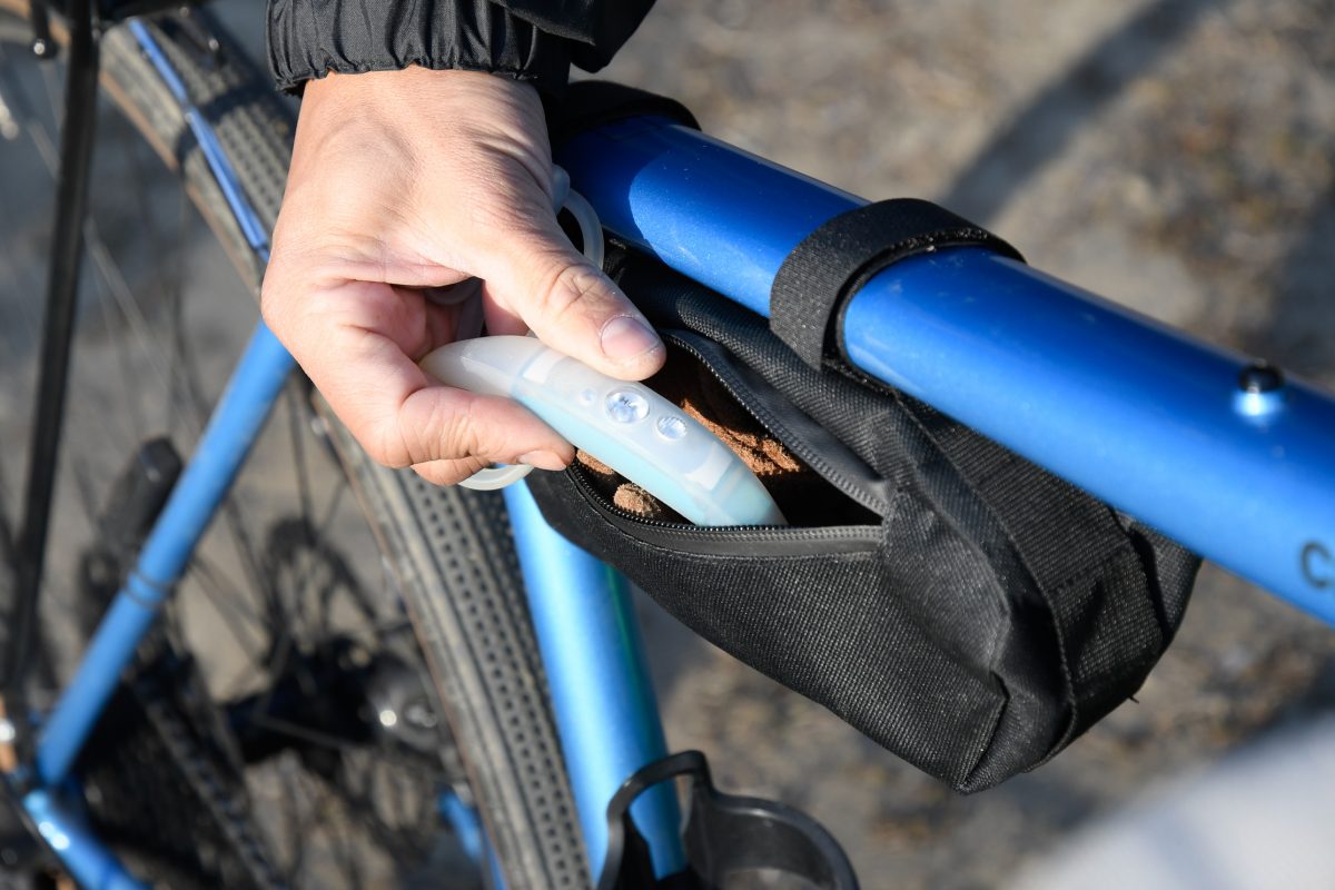 ベーシックなシートチューブ側でのフレームバッグ装着。右サイドの位置にファスナーがあり、ラクラク出し入れ