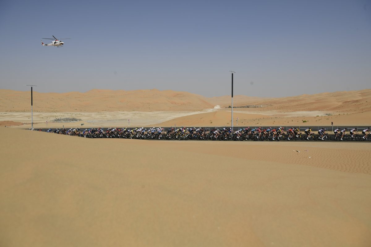 第1ステージはマディナット・ザイードを発着する184km。上下の変化が少ない、ほぼフラットなレイアウトだが、プロトンにとって最も注意したいのは砂漠に吹く強い風。集団が分断し、いくつにもエシェロンが形成されるのは中東レースの特徴ともいえるが、それが大会初日から見られるかが焦点だった。