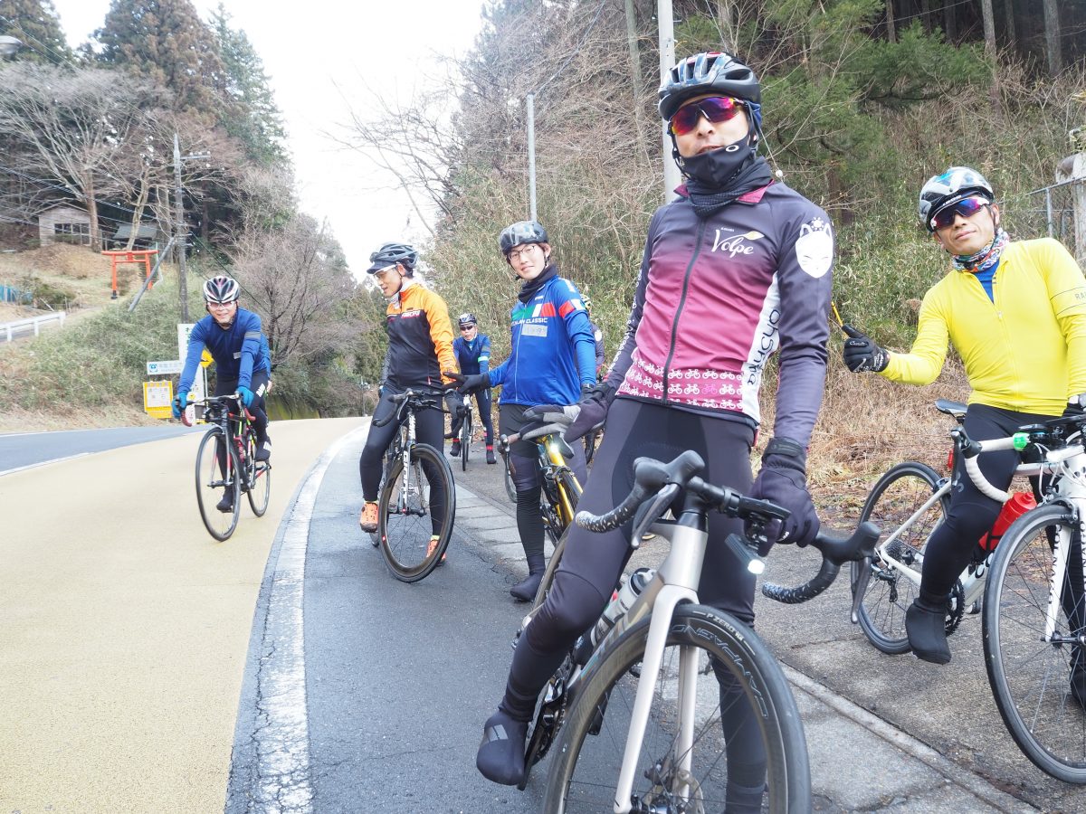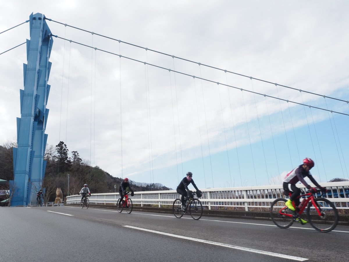 竜神大吊橋でひと休みした後は来た道を戻って下り、引き続き奥久慈里山ヒルクライムルートへ。2月らしい冷たい空気を裂きながら、各グループがいいペースで進んでいく。前半の難所は越えたが、道はアップダウンを繰り返し、中盤には突如として勾配15%の坂が現れるなど変化に富んでいる!