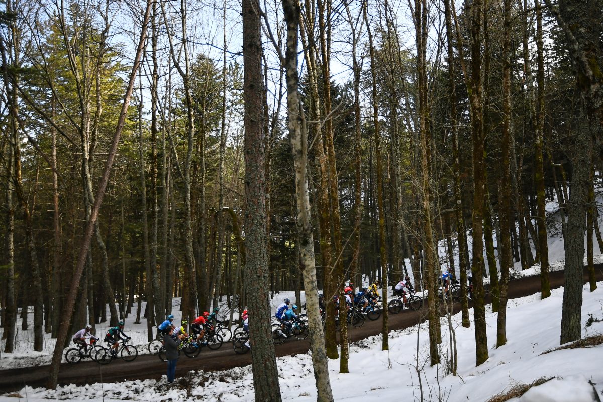 アペッキオからカルペーニャまでの215kmに設定されたレースは、終盤に登坂距離6km・平均勾配9.9%のモンテ・カルペーニャを2回上る。上りの前半に最大勾配15%に達し、その後も10%前後の勾配が続く山道を2周回。頂上通過後のダウンヒルもテクニカルで、道幅が狭くコース脇に雪が残る状況も、このステージの過酷さを感じさせる要素となっている。