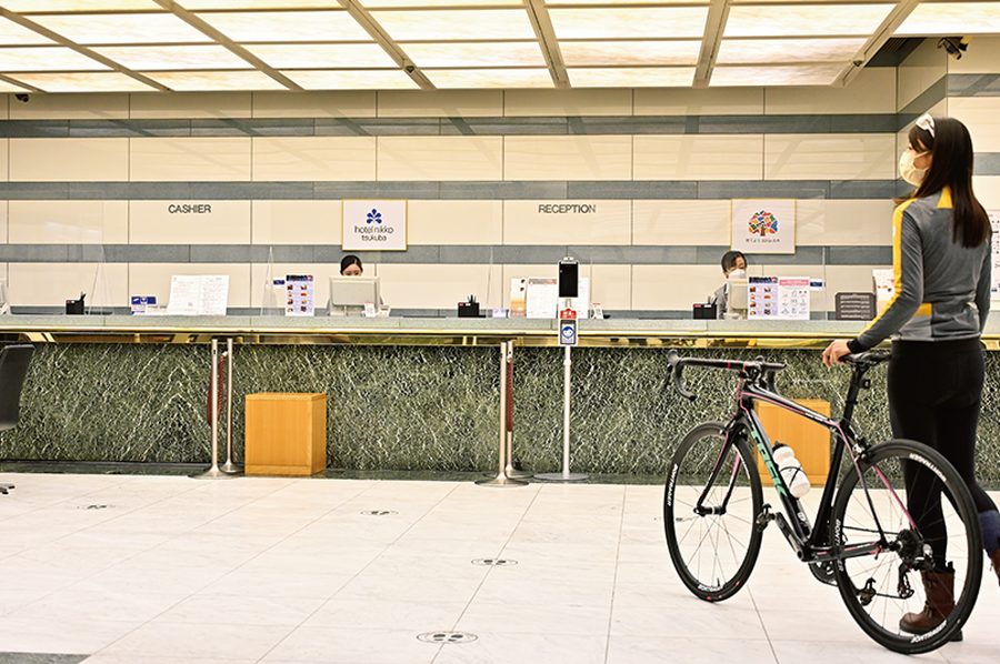洗練された空間のホテル日航つくばのフロントも、愛車とともにサイクルジャージスタイルでチェックイン!