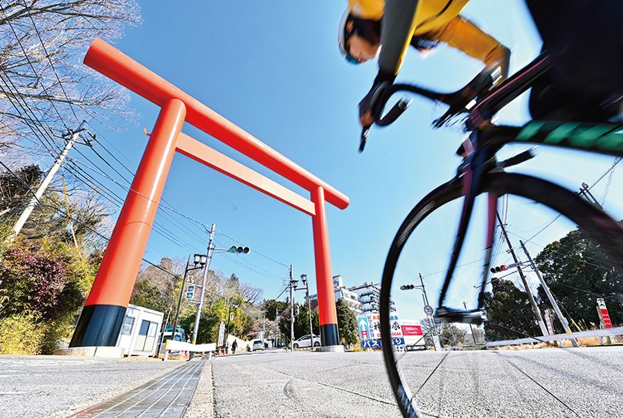 筑波山中腹に鎮座する筑波山神社。ふもとから約4kmのヒルクライムの先に大鳥居が現れる。サイクルラックが2カ所設置された