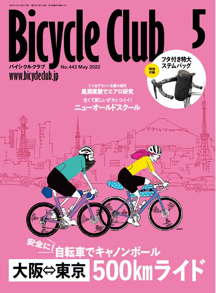 バイシクルクラブ5月号では特集は「大阪⇔東京500㎞ライド」と題して、この春新たにチャレンジしたいみなさんを応援、スーパーロングライドの楽しみ方を紹介する。このほかいま人気の1980~90年代スタイルのMTBを「ニューオールドスクールな自転車たち」として紹介する。そして特別付録は「フタ付き特大ステムバッグ」と盛りだくさん。