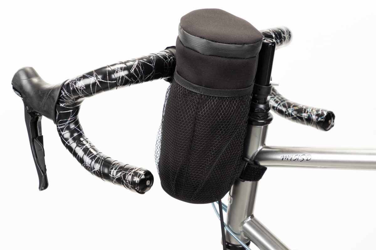 荷物の取り出しが便利なステムバッグ。チョークバッグのような形状をしながらもフタをつけたことで段差で荷物を落とさない、さらに容量を大幅アップし約1.5lの大容量で500mlのペットボトルも収まる。ステムバッグのポテンシャルを最大限に発揮した画期的バッグだ。