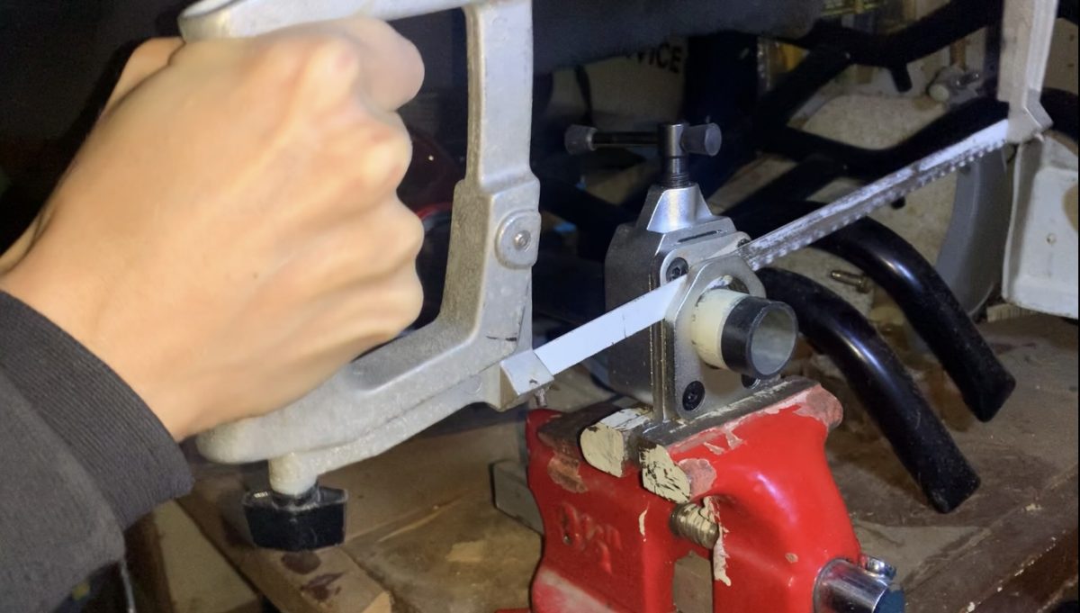 カーボンフォークのコラムカット作業中。PHOTO: Kae