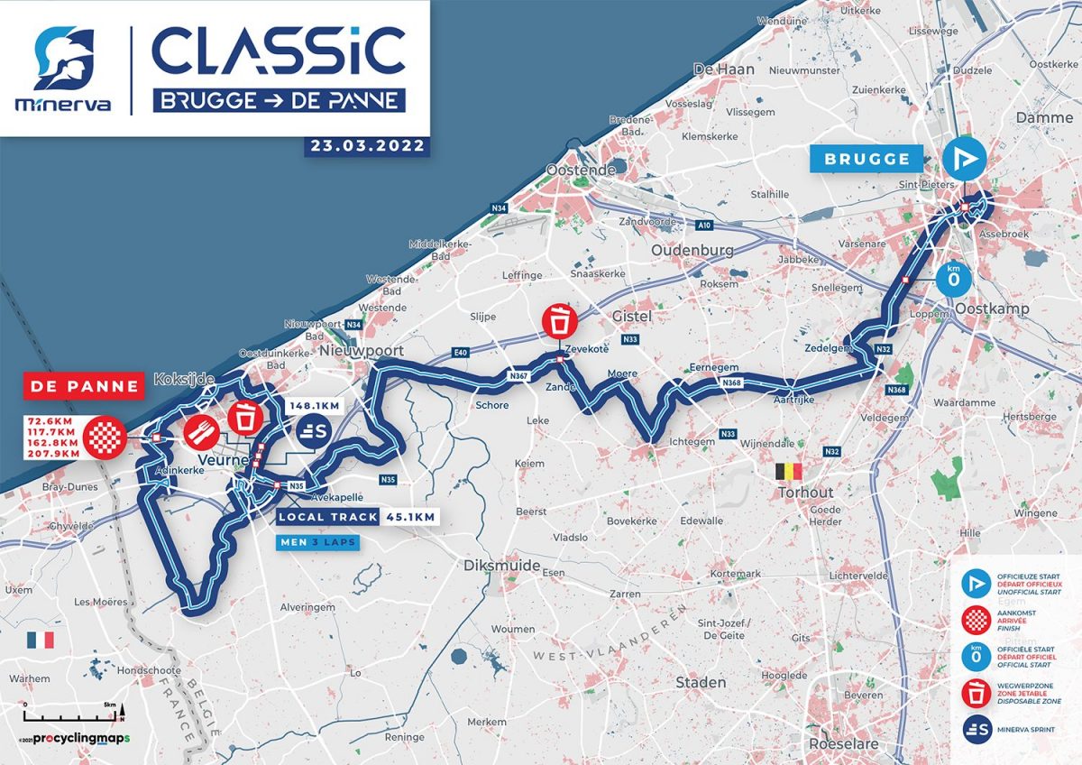 コースは大会名のとおり、ベルギー北西部・西フランドル州の州都であるブルッヘを出発し、西へと針路をとってデパンヌへとフィニッシュする207.9km。レース中盤からはデパンヌを基点とする45.1kmの周回をおおよそ3周半する。