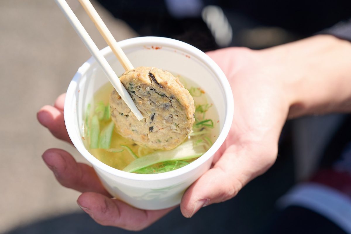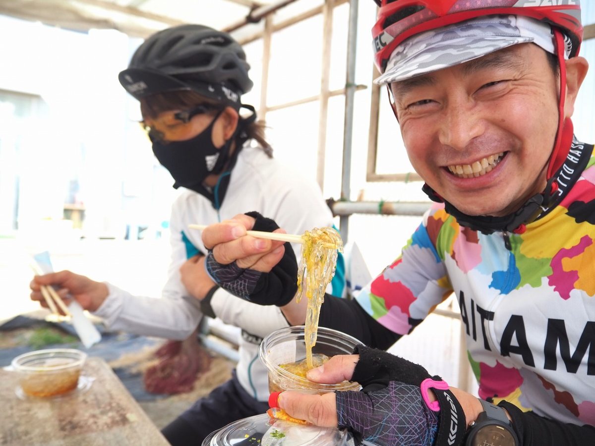当日は晴れて天気がよかったものの、風はやや強め。コース序盤の内陸部はその風に注意しつつも順調に走行していく。アドベンチャー以外の50~120㎞のコースでは、各所のエイドステーションを経由しながら、地元のグルメを食していく。ロングライドとしての大切な補給であるとともに、サイクリング自体の楽しみのひとつだ。