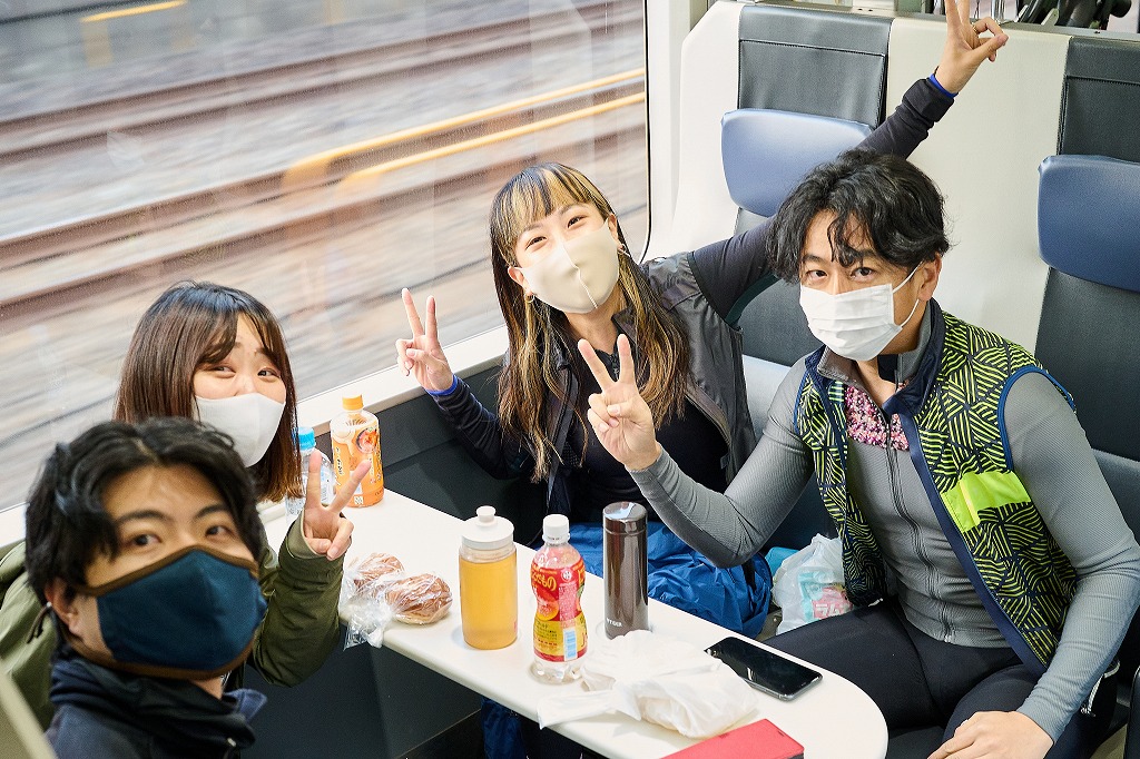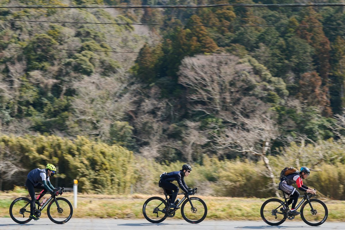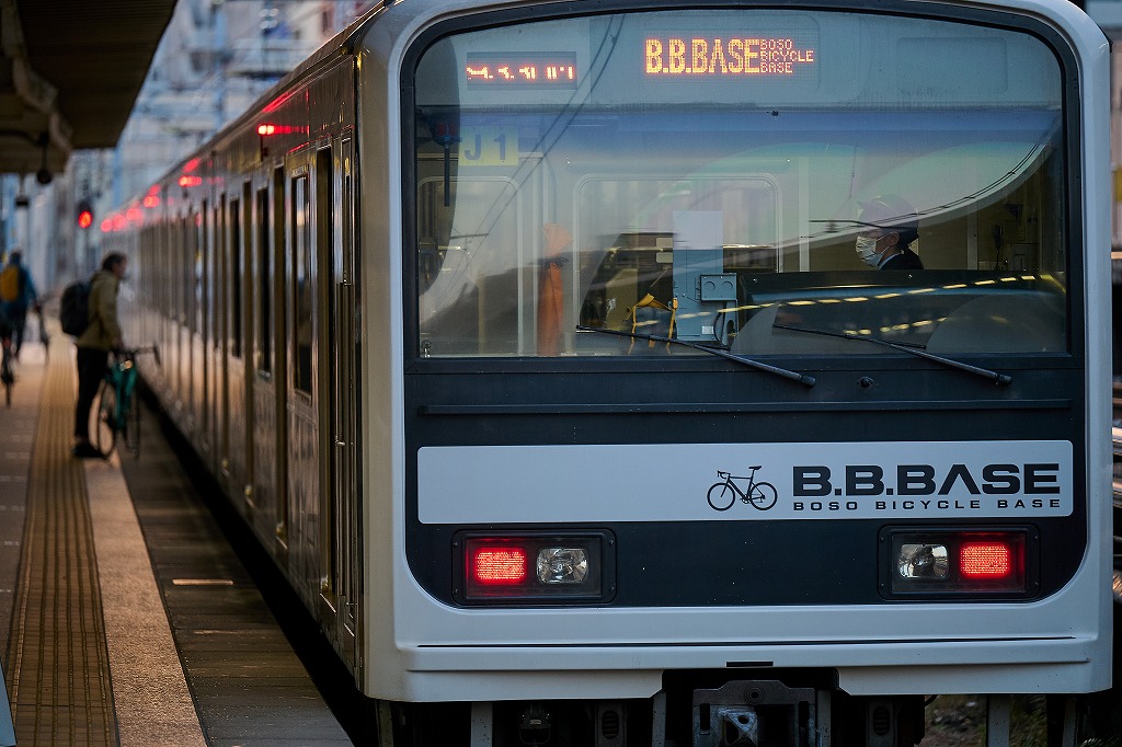 3月5日、東京両国駅に集まったサイクリストが続々とサイクルトレインB.B.BASEに乗り込んでいく。車両に自転車をそのまま持ち込んで専用スタンドにセットしたら、あとはゆったりと千葉県館山駅へ到着を待つのみ。途中の車内では、ゲストライダーの管 洋介さんとバイシクルクラブ編集長山口とのトークショーも行われた。久々のロングライドイベントという参加者も多く、マスク越しでもライドに向けてのワクワクした表情が伝わってくる。