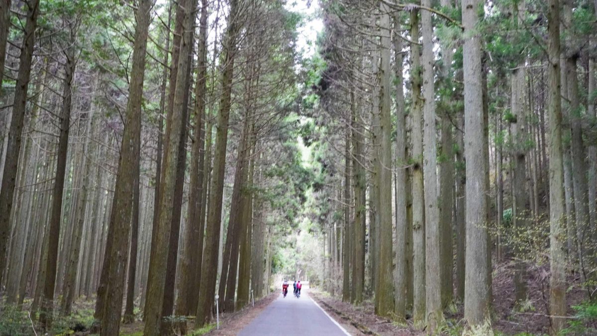 丹波竜と触れ合ったら、昼食会場である丹波篠山市の兵庫県立丹波並木道中央公園へ向かう。途中の舗装林道である下立杭柏原線はこの日のルートでも有数の山岳ポイント。