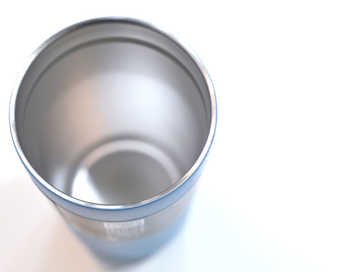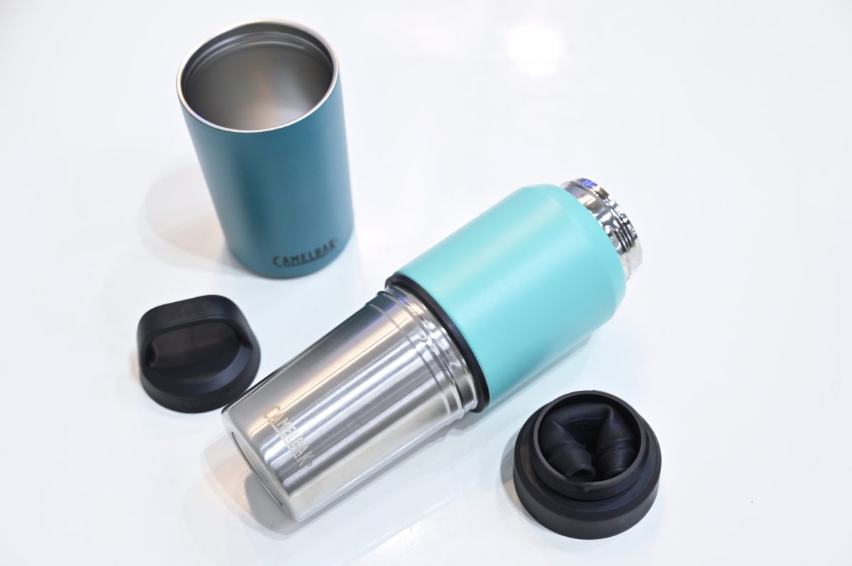 「キャメルバックの特徴としては、例えばマルチビブのタンブラーの塗装を見てください。上部の縁まで塗られています。これは口が当たったときに金属の風味を感じにくくするようにするためで、ユーザーからの要望に応えた結果です。またボディ表面全体の厚さは真空状態を保ちつつ、かなり薄く削っています。保冷・保温機能をスポイルしないギリギリの薄さです。口に当たる表面積が減り、より香りや味の広がりを感じやすいです」