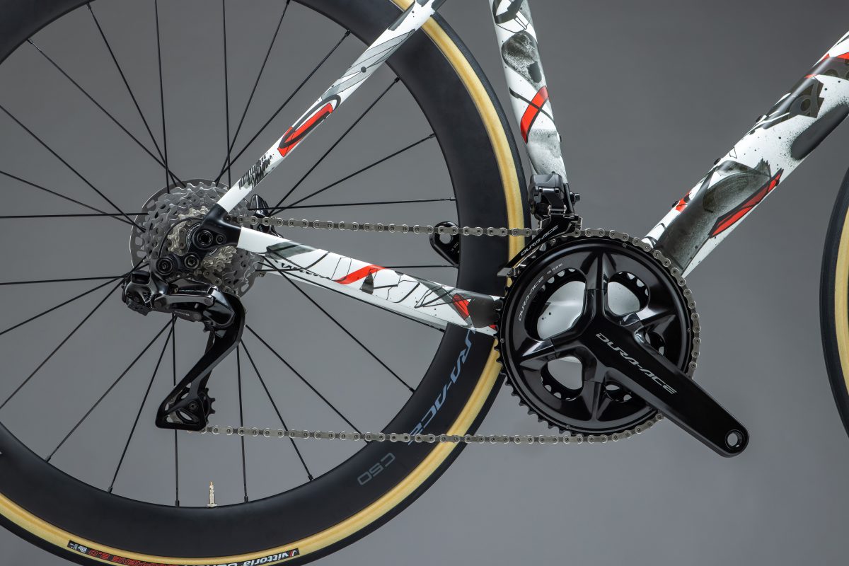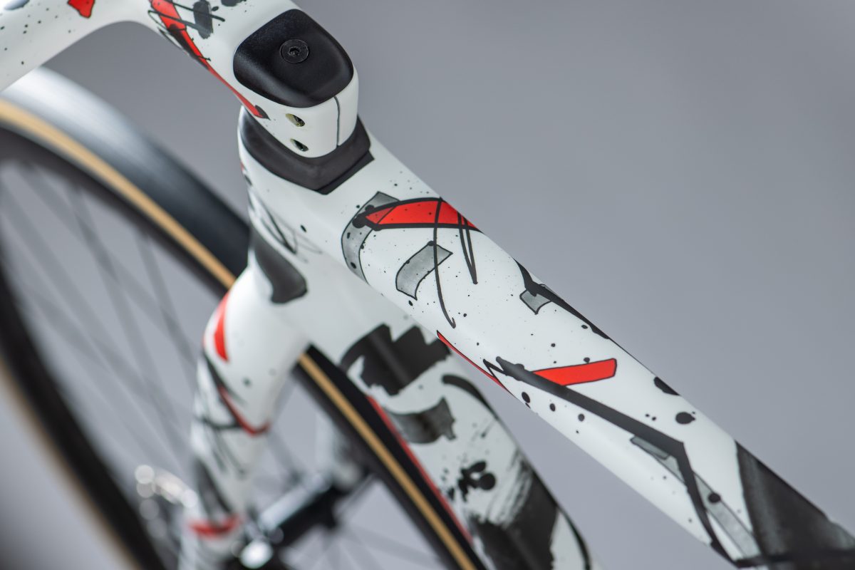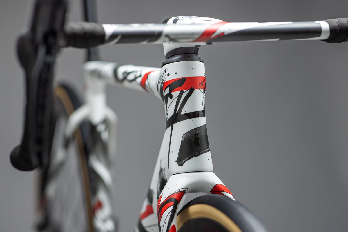 「Filtante (フィランテ)SLR」はウィリエールのフラッグシップの軽量エアロロード。今回、ウィリエールではシマノ100周年を迎えたタイミングに合わせて日本人アーティスト、井上 純さんのグラフィックを採用した限定モデルを制作。グラフィックにより、井上さんの世界観を具現化した仕様となっている。