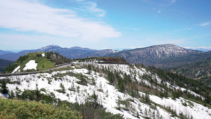 いや〜やっぱり感動しますよ。見たところ雪壁は3mほどで、例年に比べると低めだったかもしれません。でもそれでも超感動! それに山頂付近は高い木がほぼなくなり、ごつごつした岩の色、緑の草と白い雪のコントラストがめちゃくちゃ映えて美しい! 青空だとほんとうに遠くまで見渡せて、たまりませんよ。