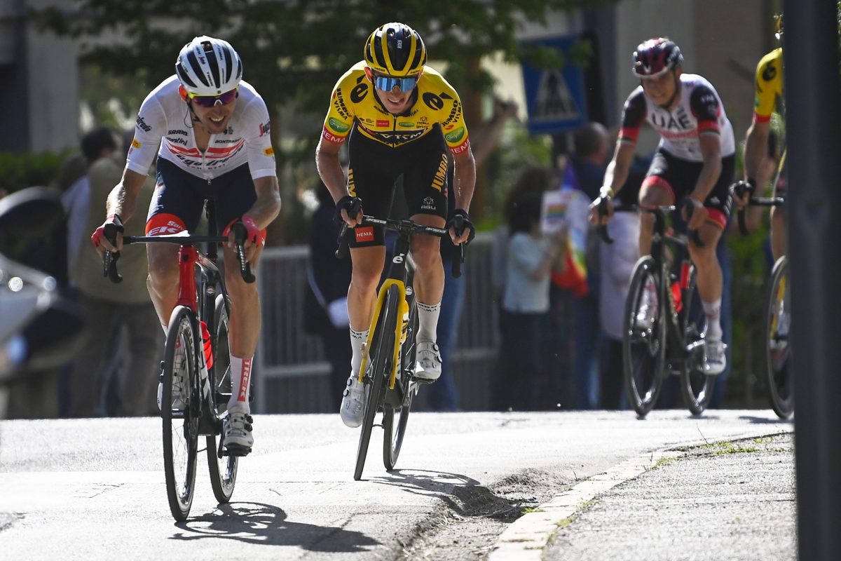 逃げ切りの可能性が膨らむ先頭の選手たち。中間地点を過ぎてからの2級山岳モンテ・グランデ・ディ・ヴィッジャーノでプールスが脱落し、続く3級山岳ラ・セッラータの上りでデュムランがペースを上げるとヴィレッラとカマルゴも後方へ。4人に絞られたところで、デュムランがたびたびアタックを試み、モレマとフォルモロがカウンターアタックで応戦する流れへ。一時はボウマンが遅れたかに思われたが、テンポで追いついて、そのまま山岳ポイントを収集。フィニッシュに向けて急ぎながら、4選手の駆け引きが激しくなっていく。