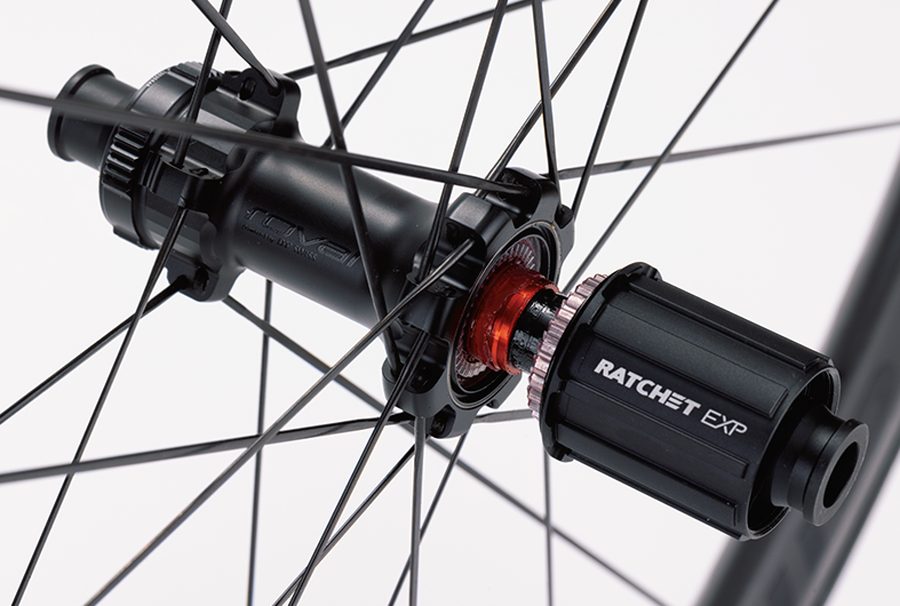 軽量なチューブレスレディリムに加えて、ハブを一新。新形状のロープロファイルハブボディと切削ローターマウントにより前作よりも50gの軽量化を実現。DTスイスのEXPフリーボディとSINCセラミックベアリングで効率が向上した。