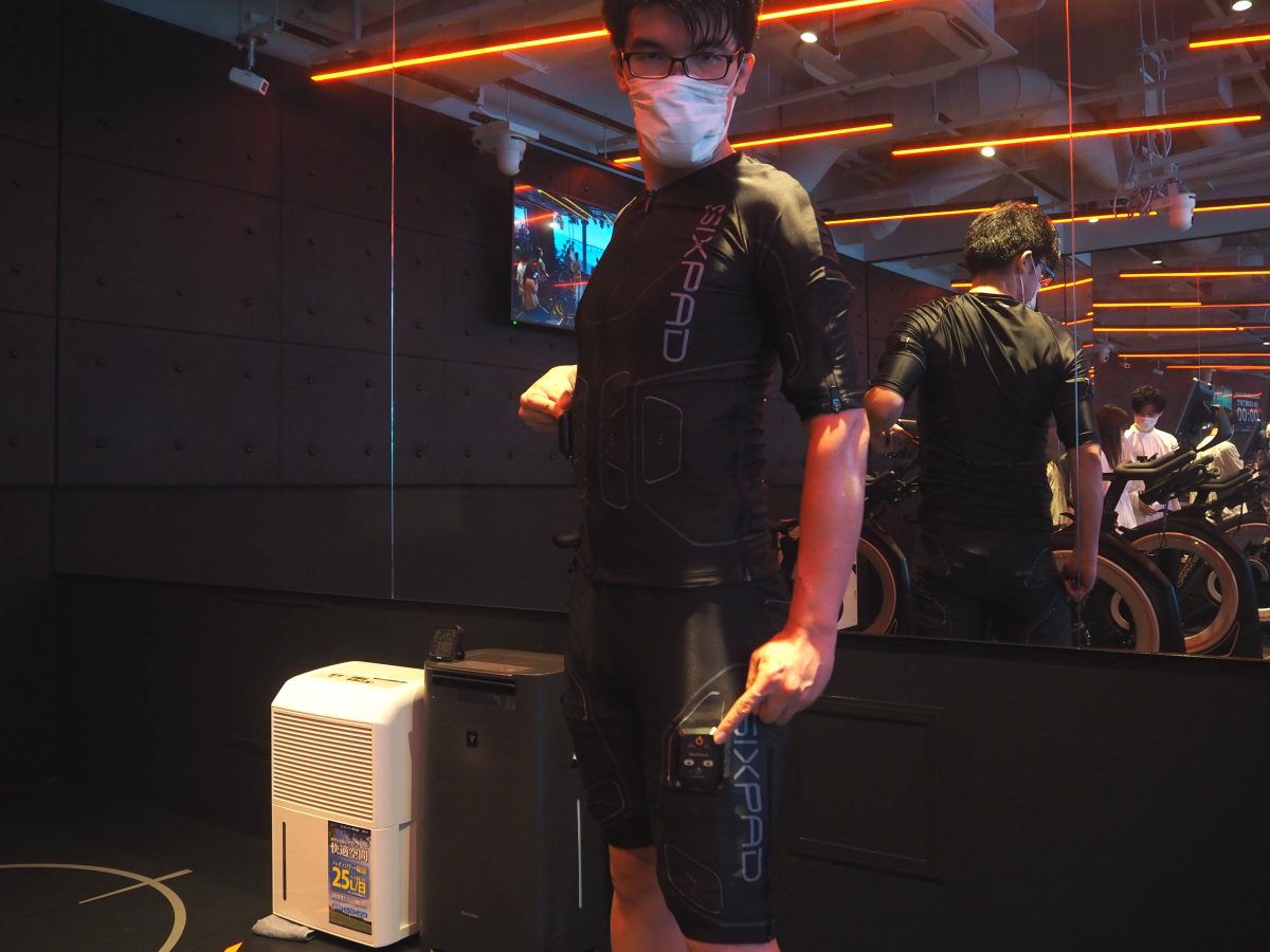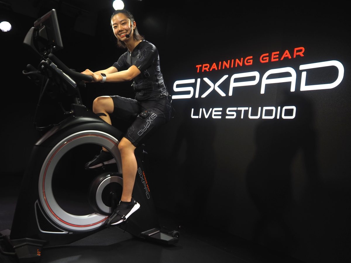 「CALM CYCLE for Retreat」は 、SIXPADHOME GYMでは初の試みである実景映像を用いたバイクトレーニングであり、SIXPAD HOME GYMのオンラインレッスンと都内の原宿で行えるスタジオレッスンを通じて、いつでも好きな時間にオンライン×旅行を堪能できるというもの。今回はSIXPAD LIVE STUDIO原宿の大型モニターや音響 、LEDといった先進の技術を駆使したなかでの体験会。さっそく専用のスーツを着てスタジオ内のトレーニングルームへ。