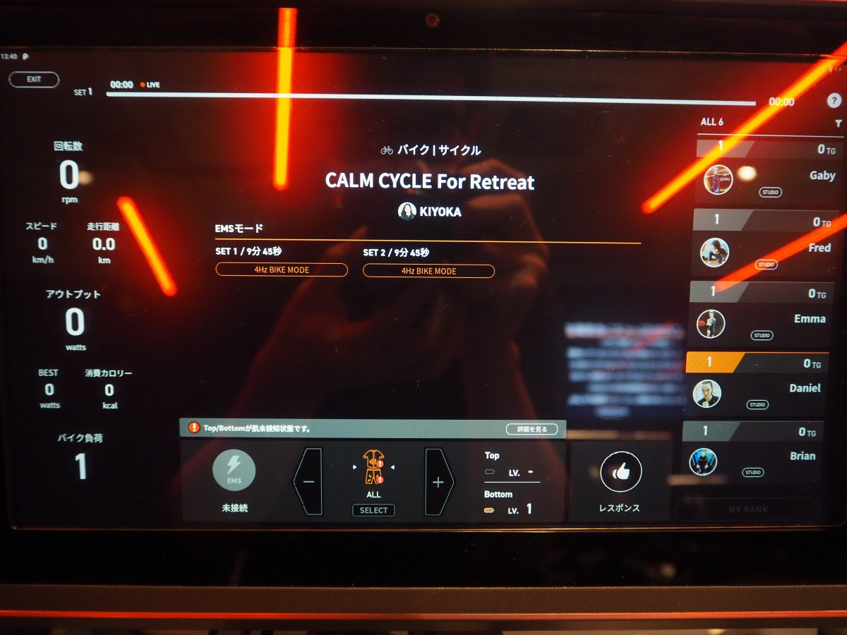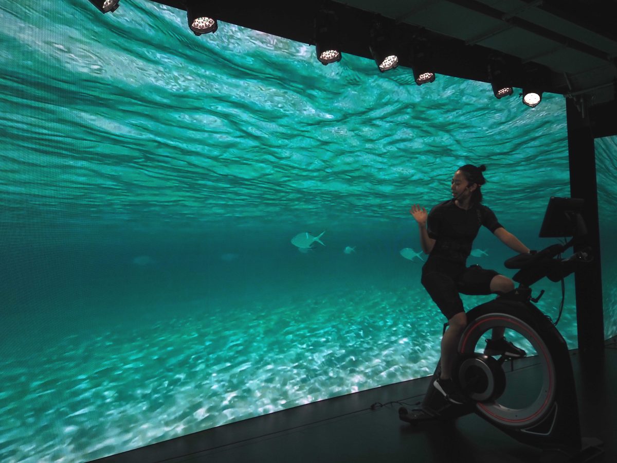 さっそくトレーニングが開始されると軽快な音楽とともに、南の島の映像がスタジオに広がっていく。と同時にスーツへ「ビクッ! ビクッ!」と電気刺激が伝わる! しびれるというよりは小さな振動の連続だ。強すぎると感じるならば目の前のディスプレイをタッチして、その強さを変えられる。続いてKIYOKAさんから「さぁここで立ち上がってペダリング!」「ギヤを上げてみましょう」「はい、座ってゆっくり息を整えて」とタイミングよく指示が入る!